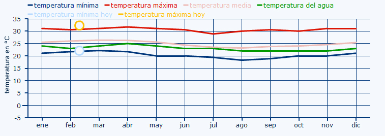 .En esta época desparecen las lluvias, el clima es más seco y la temperatura cede unos 4 grados celsius en los máximos, mínimos y sus promedios, llegando a 24 grados en la máxima y unos 16 grados para la mínima.